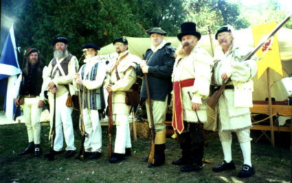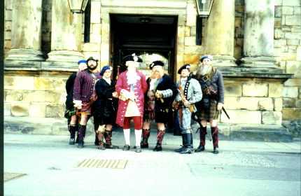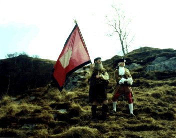Shortly after Prince Charles Edward Stuart landed at Glenfinnan and began to raise his army I (on the left) was promoted to Standard Bearer for Life Guards. Even though I felt like a gey muckle target carrying a great flag on the battlefield, it was an honor to be so close to His Highness during the campaign. Besides the Sassenachs (a pejorative Gaelic term for the English) couldn't hit the broadside of a 'Munro'. (What's a Munro? In 1891 Sir Hugh T. Munro, of Lindertis, Angus, surveyed Scotland's mountains above 3000 feet (914.4 meters) and produced his "Tables" cataloging 236 peaks which he considered to be separate mountains. For this reason Scottish peaks above 3000 feet are called Munros.)